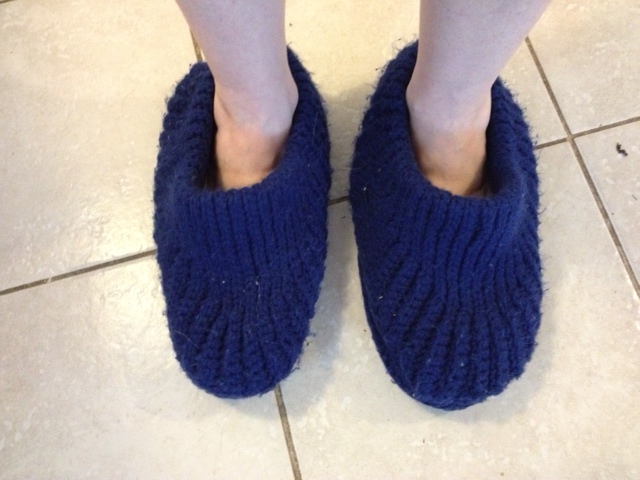 The 10 Hours or Less photo of the slippers is up top. That’s how they should look—all snug and cozy on your feet. And they could be that if you follow the pattern. However, if you happen to be a reckless crochet rebel like me, who’s been allowed to flout the rules for too long, your project is bound to look like this below. It’s more a swimming pool for the feet. But you know what? I wear them and just shuffle on the floor. As long as I don’t lift my feet off the ground, they actually work pretty well. Thanks to my excellent teacher, I’m not completely hopeless. And I am hiding one dead body—there’s a mini Quasimodo bump in the back.