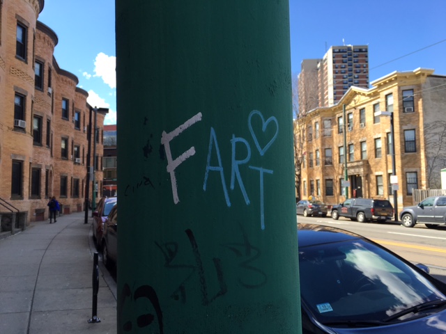 I wasn’t sure I could pull off a post about farting. A friend and I had been laughing about it, so it seemed funny, but maybe it was one of those “had to be there” moments, and you all would scratch your heads if I attempted to translate it here. But a couple of things happened on the way to writing about farting: Another friend told me about a group of poets who collaborated on a fart poem, and I saw the picture above on a pole walking in Boston. Clearly the universe was sending me messages. But the final push was my Scrabble app dictionary declaring that “fart” was not a word. Then, I knew I had to speak up for fart justice. Starting with the unjust fact that Scrabble does allow “damn,” a swear word. I thought Scrabble perhaps had some high literary standard and a soft spot for Lady Macbeth, but that argument fell down when the Scrabble dictionary also included “selfie,” which has been a word for about five minutes. Whereas, according to my faded, dog-eared Webster’s Ninth New Collegiate Dictionary that survived my college days, a house fire, and numerous moves, fart has been around as a verb since the 13th century and as a noun since the 14th century. The second definition of fart as a noun is a foolish or contemptible person. I may have to try to bring that definition back in fashion, especially if Trump becomes president. I’ve only heard it used in the phrase, “old fart” to refer to an old fuddy-duddy person, but I like the nuanced layering of foolish and contemptible. Of course both definitions point out that the word is “usu. considered vulgar.”