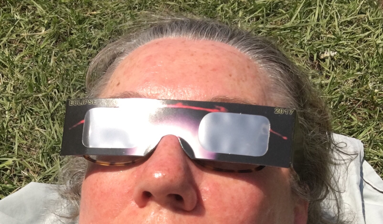 And then it started. Wearing our glasses that looked like we were from a 50s 3D movie, we watched as the first dark sliver appeared. The glasses block out everything else, so all you can see is a sharp gold ball, with an ever growing black bite getting taken out of it. It was great just to focus on that, and try to forget about lying on the ground in the sun’s heat. The clouds came and went. When a cloud blocked the sun, we cooled off in the car. But then I started enjoying watching the way the glasses made everything blank, and then the gold ball would peek through the darkness as the cloud passed by. While the eclipse was already an immense gift, this slow uncovering of the partially eaten gold ball made the experience even more dear. This might be all I was going to get, so I sweated, watched, and decided whatever sunscreen was left on me would have to do.