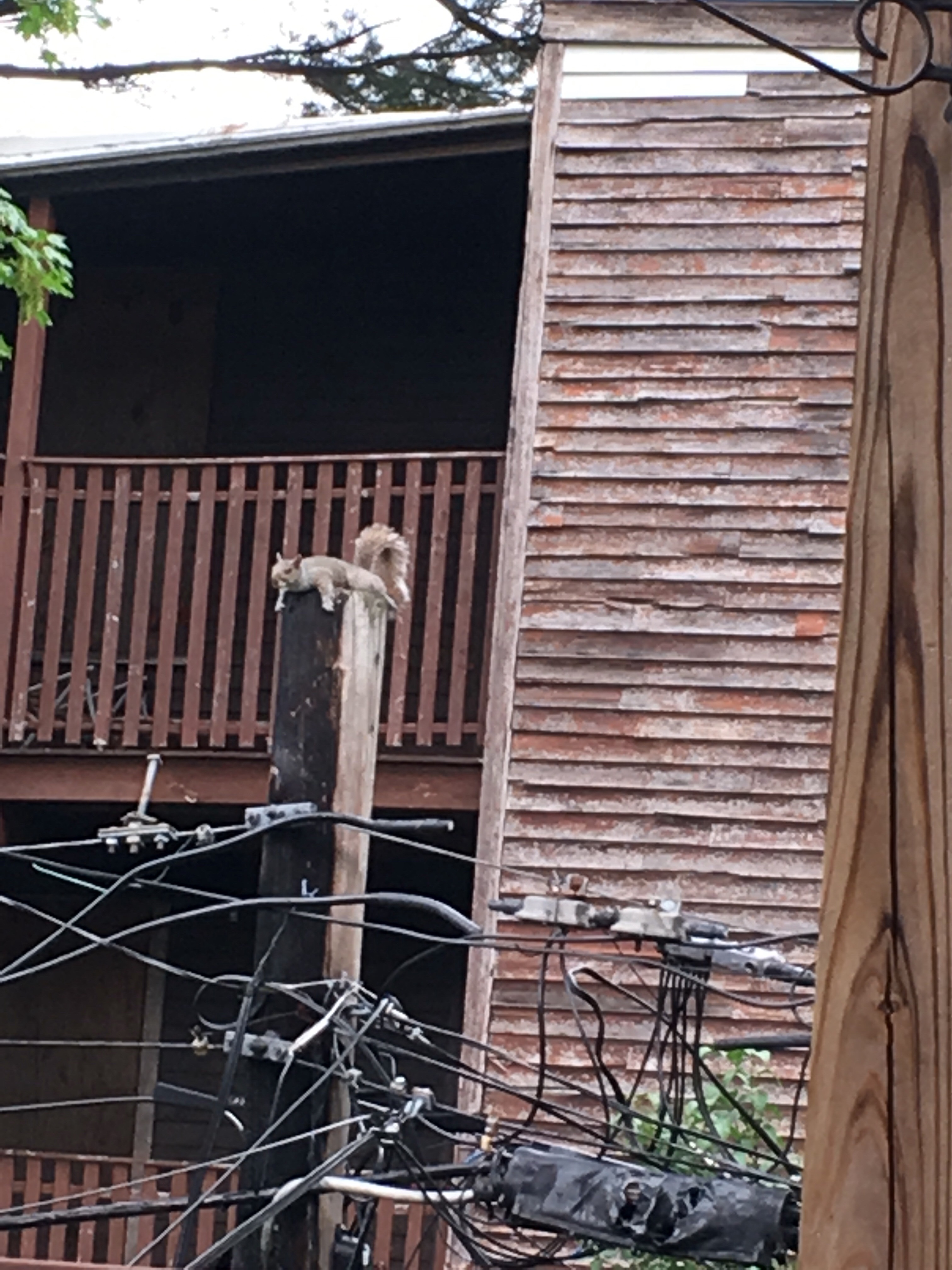 Squirrel chillin’ on top of a telephone pole. You may recall earlier this spring, I posted a photo of a squirrel napping. It was on a branch right above this pole.