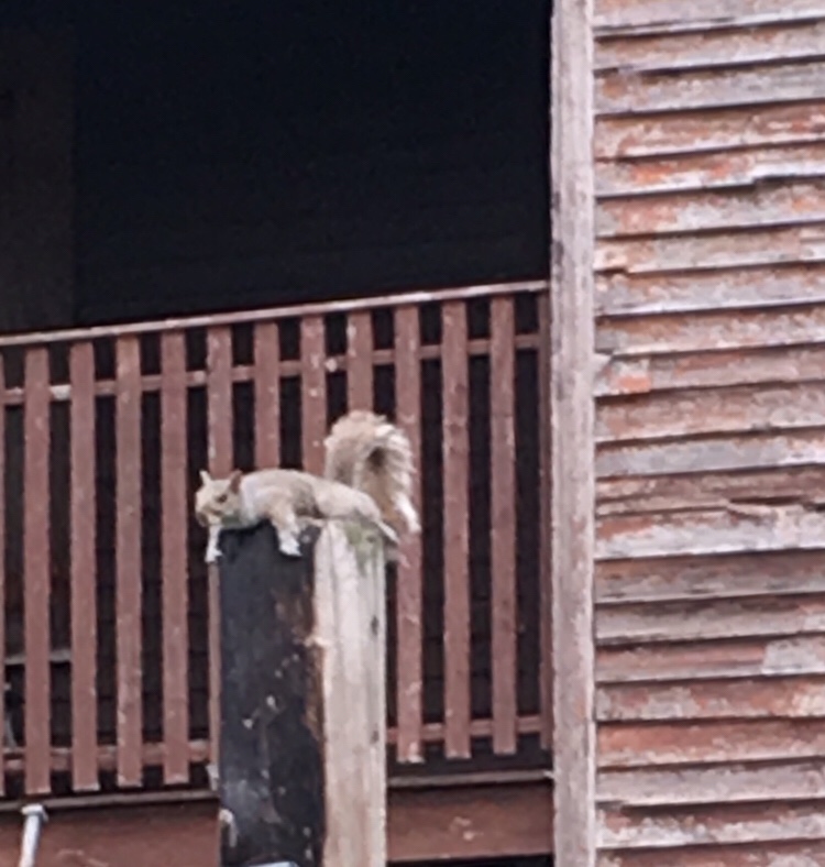 Pole-top squirrel stayed there for several minutes, which is like a week in frantic squirrel time. Seriously, these are some of the laziest squirrels I’ve ever seen. Or maybe they have achieved work life balance. That may be it, because pole-top squirrel then stayed in this position for another few minutes, which I think is the yoga position, Down Squirrel.