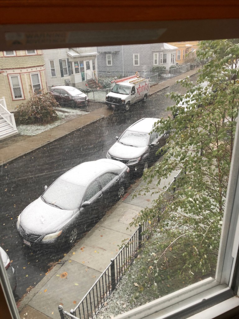 Hundreds of previously healthy and now broken tree branches later, we had more like 4-5 inches, the leaves catching the snow like a thousand flat roofs. You didn’t walk on the park paths and sidewalks, you serpentined.