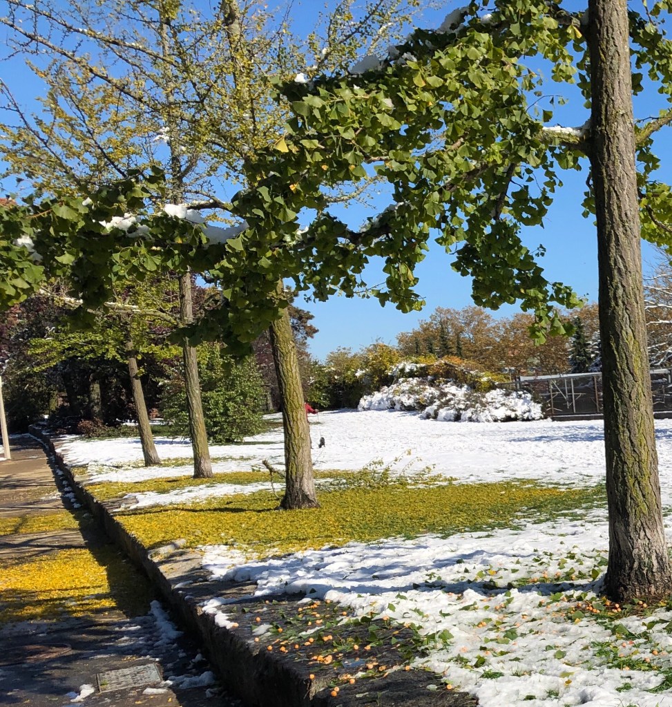 Yes, the first snow is always kind of magical, and it was sticky and good for building snow people. And it was also weird to see all the leaves laden with snow up in the trees, and also leaves piled on top of the snow on the ground. The oaks and maples were hanging tough with their leaves, pretty much telling the snowstorm where to stick it. The ginkgos that had turned yellow, on the other hand, were like, nope, I’m out. There was a carpet of yellow leaves and berries on the snow beneath each tree with hardly any left on the branches.