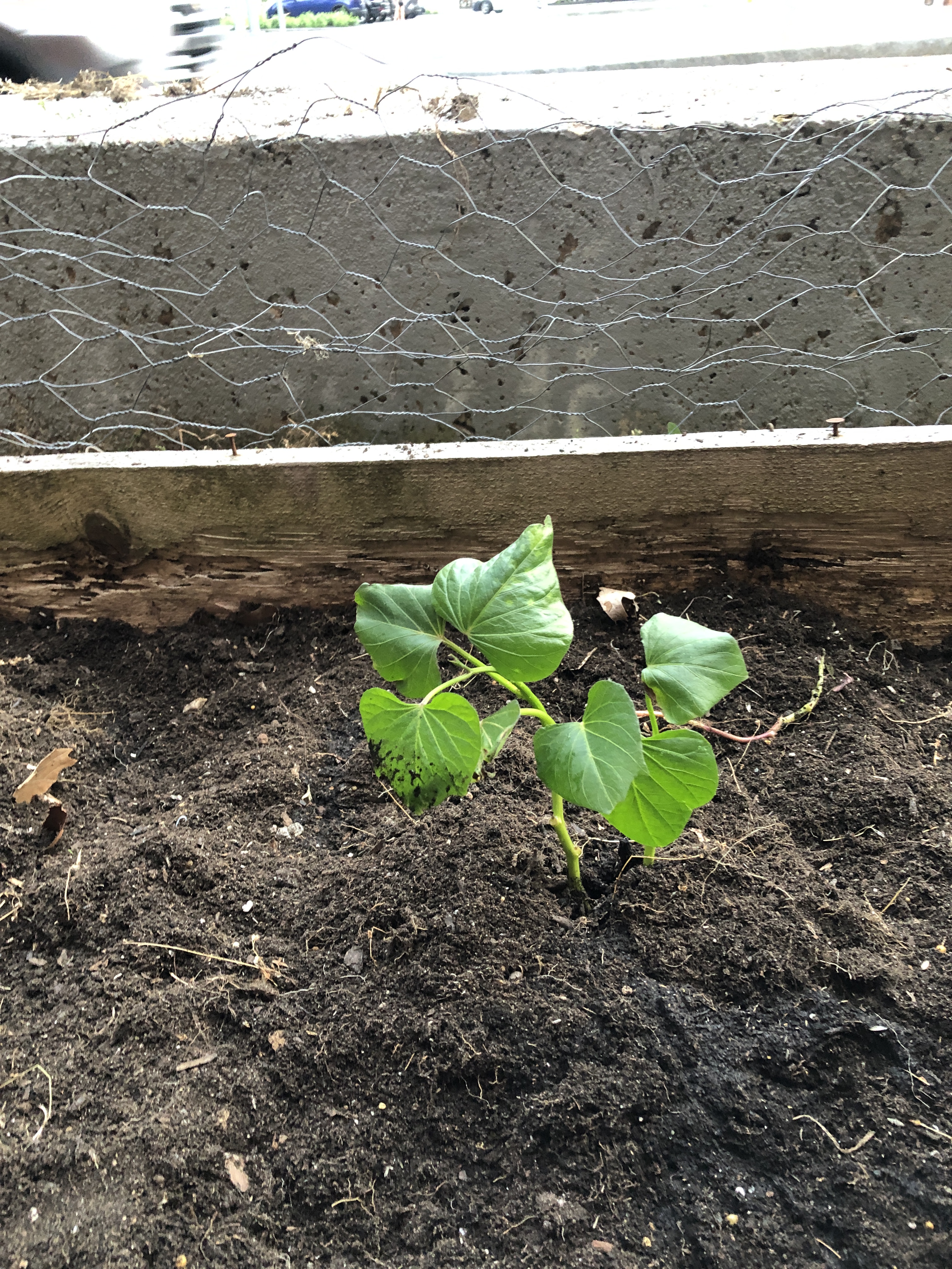 I was too busy the first day to plant. The second day, it was merely cloudy, so it actually felt like sun compared to the day before. I cleared a 2-foot-square area and planted 2 sweet potatoes. We’ll be back at the spot soon, and we’ll see how they do.