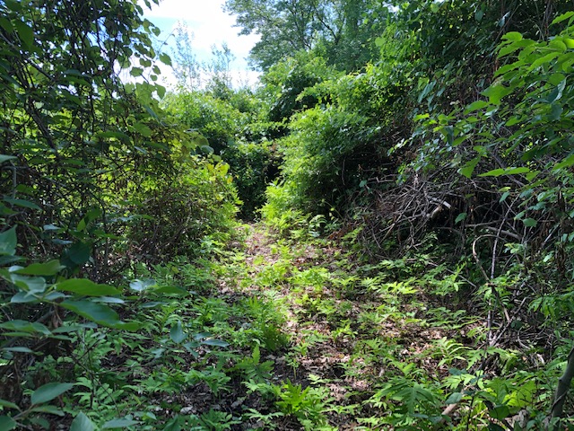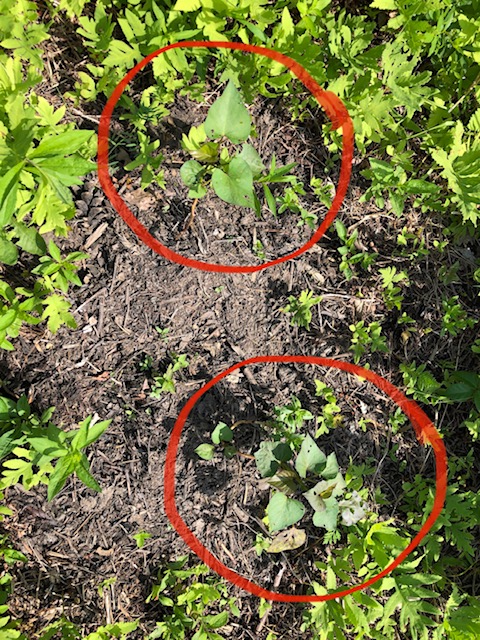 The other plants were starting to encroach, so we pulled those out and we were in the middle of a heat wave, so poured about 2 gallons of water to give them little boost. We also had to clear out the campground — there was a fair amount of plant growth in just the 3 weeks we were away, but we asked for it by giving the understory unobstructed light with the first clearing. We know we’re not going to win, we just have fun playing the game. Here’s a before and after: