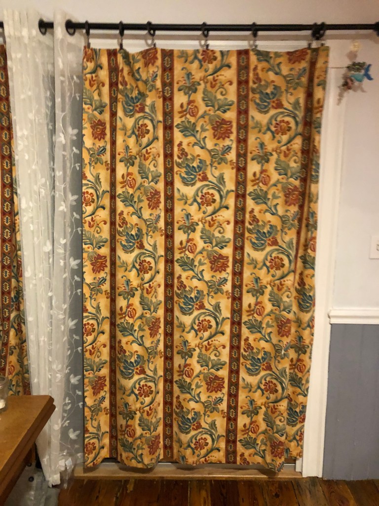 This last pair we made after taking a trip to a local fabric store mecca for designers and amateurs alike, Zimman’s in Lynn, MA (since 1909). I can easily get overwhelmed in a JoAnn’s Fabric store, never mind being in that historic cavernous warehouse of every kind of fabric texture, color, and weight. But mom, who had sewn our clothes when we were little and later hand quilted, walked through that place easily, expertly running her hand along the bolts, feeling the texture while assessing the patterns. The curtains were for glass doors in my condo leading to a small deck, and we had agreed on some basic principles beforehand–I wanted them to match the sunflower gold of one of the walls. Other than that I had no clue, and I followed her like a lost, overwhelmed puppy, completely trusting and in awe of her fabric judgement.