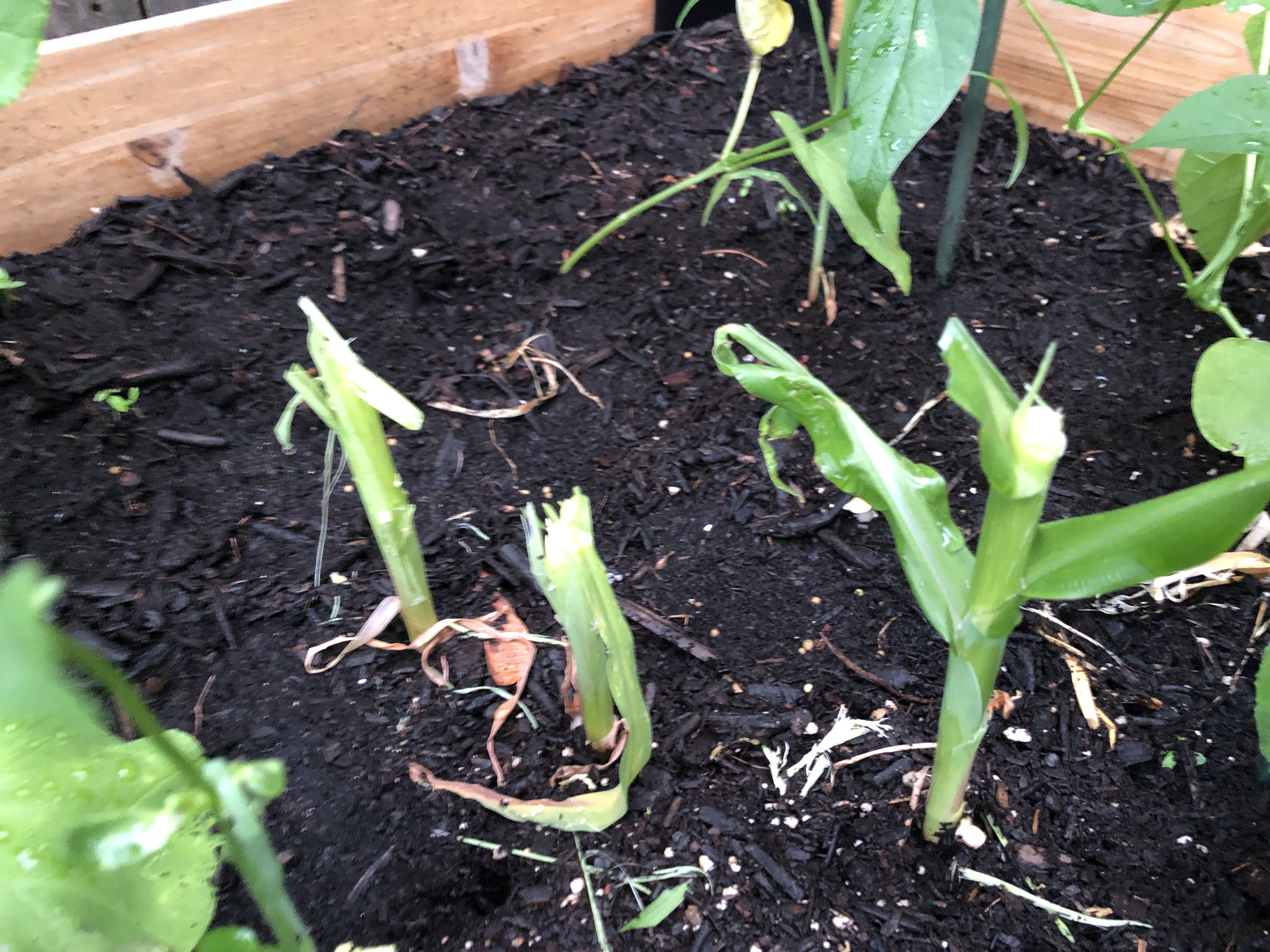 With apologies to Robert Frost, but the thing that doesn’t like walls also doesn’t like corn, or at least my corn. My poor little tween corn was barely 2 feet high and hadn’t even really reached adolescence before something tolerated the electronic gizmo I bought to deter critters — enough to chew the 3 remaining stalks down, plus one bean plant, one at a time over a number of days. Bahstid. I’m putting my money on one marauding rodent. I saw one slinking around at dusk the other night before escaping under the fence. If it goes after anything else, I will have bring out the big guns. I have no idea what that is yet, but that’s what Google is for. And I’m may be becoming one with nature, but don’t mess with my plants.