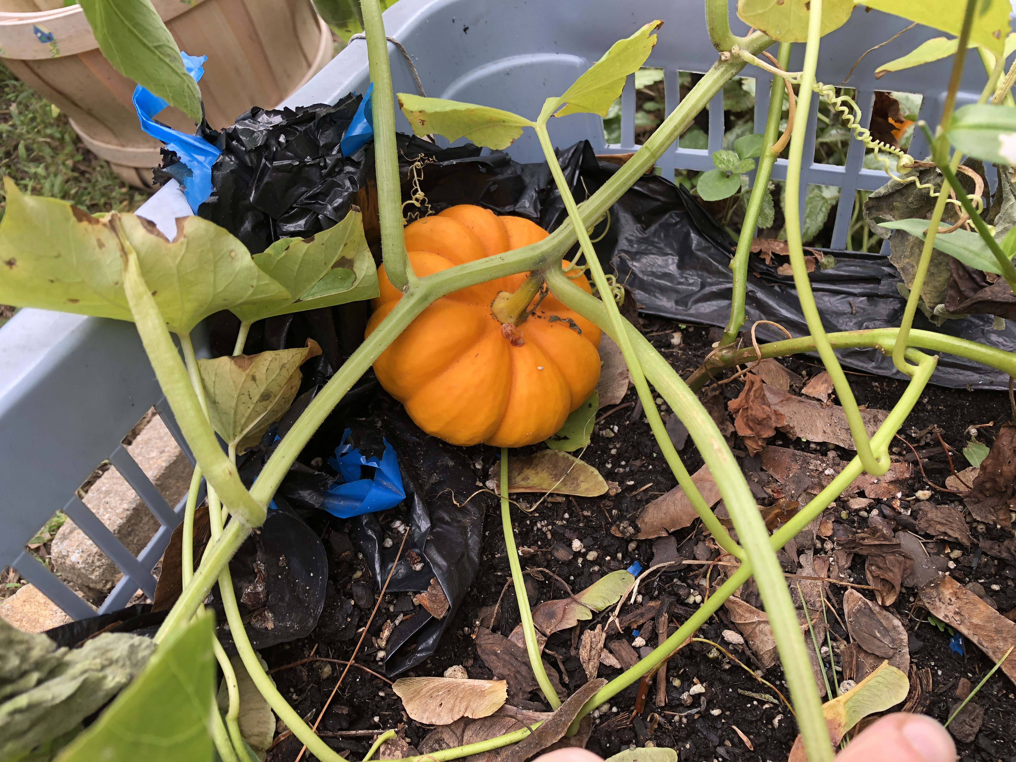 And the sweet surprise was that the little squash plant that grew by itself, literally next to a tree trunk, actually produced 2 little mini pumpkins. They are also called Jack-Be-Little, which is about as stinking cute as it gets. You can also eat them, but who knows what is in that dirt (hence my container garden), so I will just admire them. Here is one snuggling up to the sweet potatoes in the laundry basket.