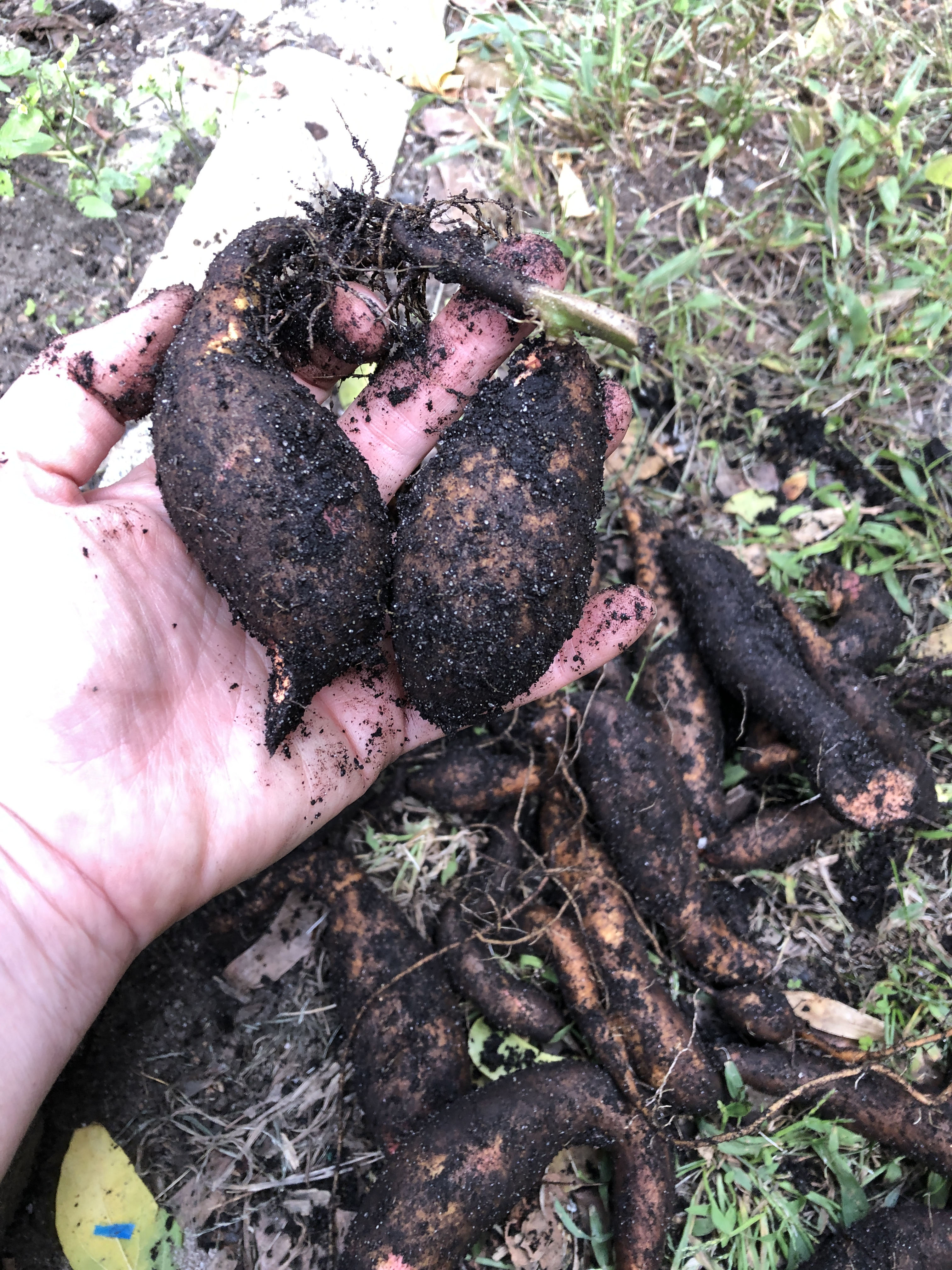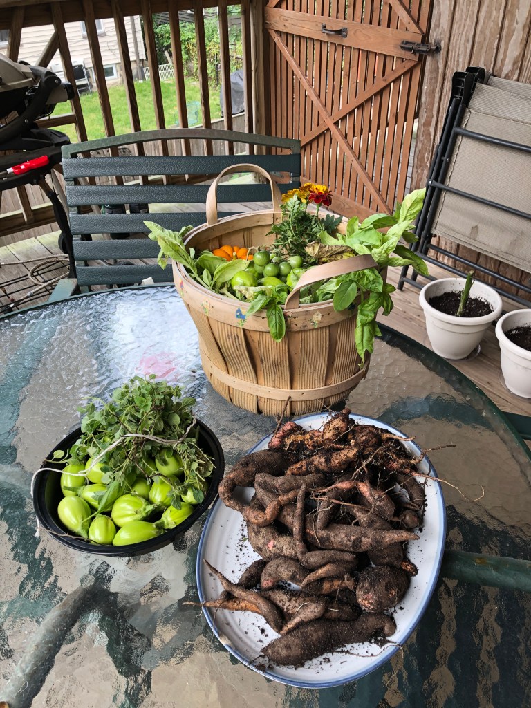 Best thing to harvest? The sweet potatoes! I had so much fun digging them up. You just don’t know what you are going to get. And since mine are in a laundry basket and a flower box, the potatoes like to snuggle down at the bottom, so you really have to dig in. Finding one is like discovering buried treasure. This was definitely my best year yet. I usually get the long skinny ones, but I also got a couple of rounder ones. Whoo hoo!