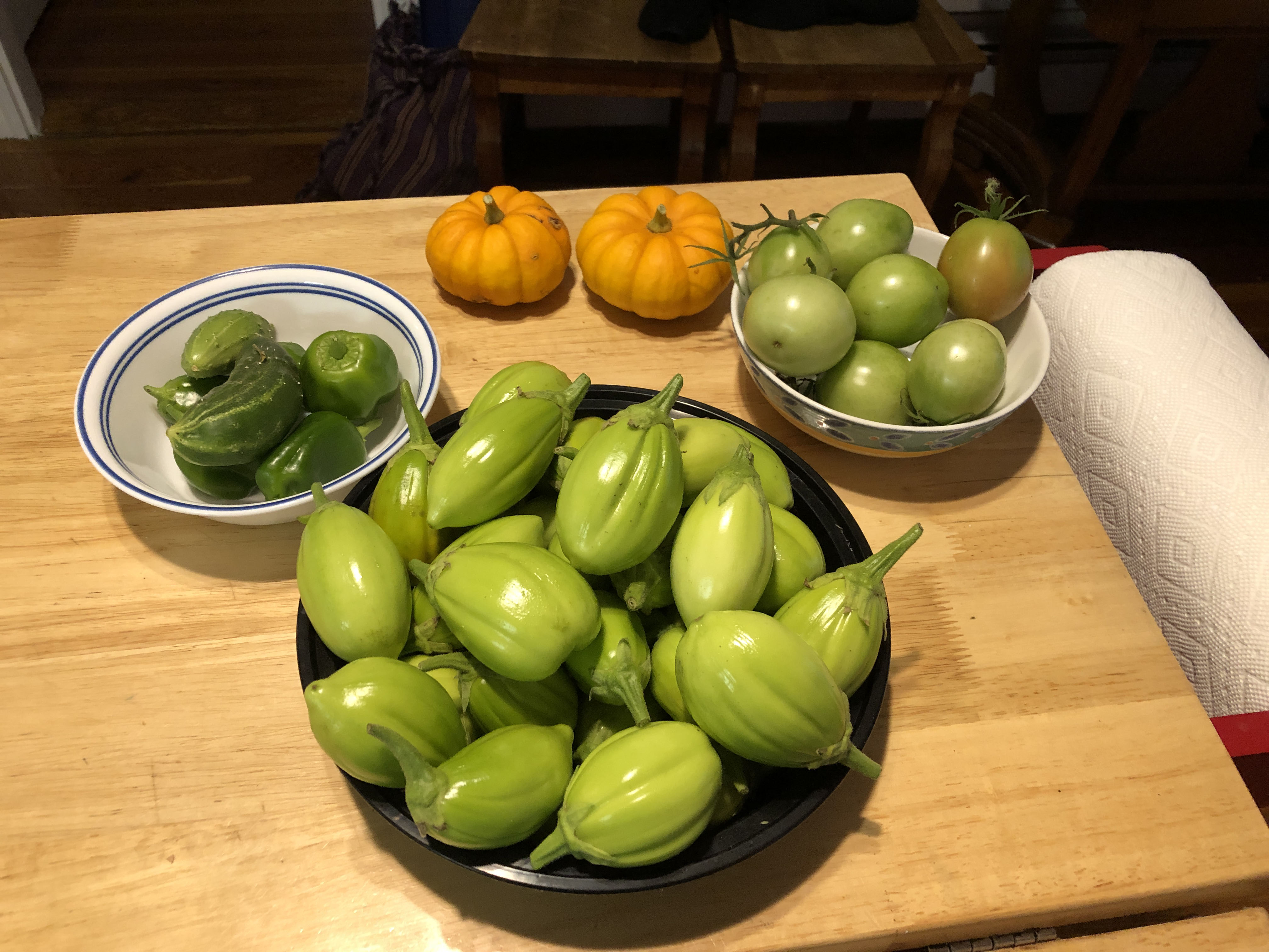 I picked most of the jilo and prepared to overwinter some of the plants. I let 2 plants keep going because their fruit is turning red, so all they are good for now is seeds. But as I’m writing this I just realized, they turned red kind of early, so maybe I don’t want to save seeds from an underperforming plant. Dang. OK, maybe I just try not to be super farmer over here and enjoy the jilo I have and trust the seeds I get from the nursery.