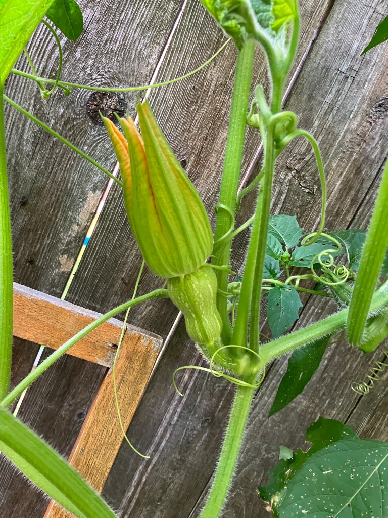 Oh, the vines seemed to love the rain, they traveled everywhere and began to climb up the back fence. I was so proud. I started those babies from seed indoors, seed! I worried over them, poked, hovered, and encouraged. When they were ready, I planted them lovingly into the raised bed: 3 plants this year instead of 2 like last year. Last year I got exactly 3 butternut squash, which I was very happy about, and I enjoyed their soup very much. One more plant might get me 4 or 5, which would be even better, no? So I decided to add a third plant. I’m not a greedy person, and I don’t need a huge harvest. As my gardening friend Becky likes to say, there are grocery stores if your harvest isn’t what you had hoped for.