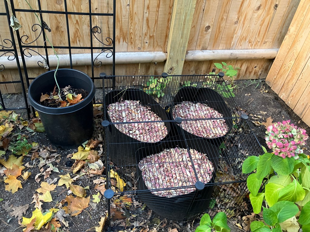 The second year, last year, I bought some fencing to put around and on top — ha, take that critters! I did get little baby bulbs, so I determined that they needed a little bigger area to grow than the window box. This year, I have them tucked away in roomy grow bags, completely enclosed and mulched. Come to mama, sweet little gahlic! And a big thank you to my brother for giving me his awesome seed garlic. He lives in Maine and has a real garden where the critters are normal and actually don’t like the garlic. Go figure!