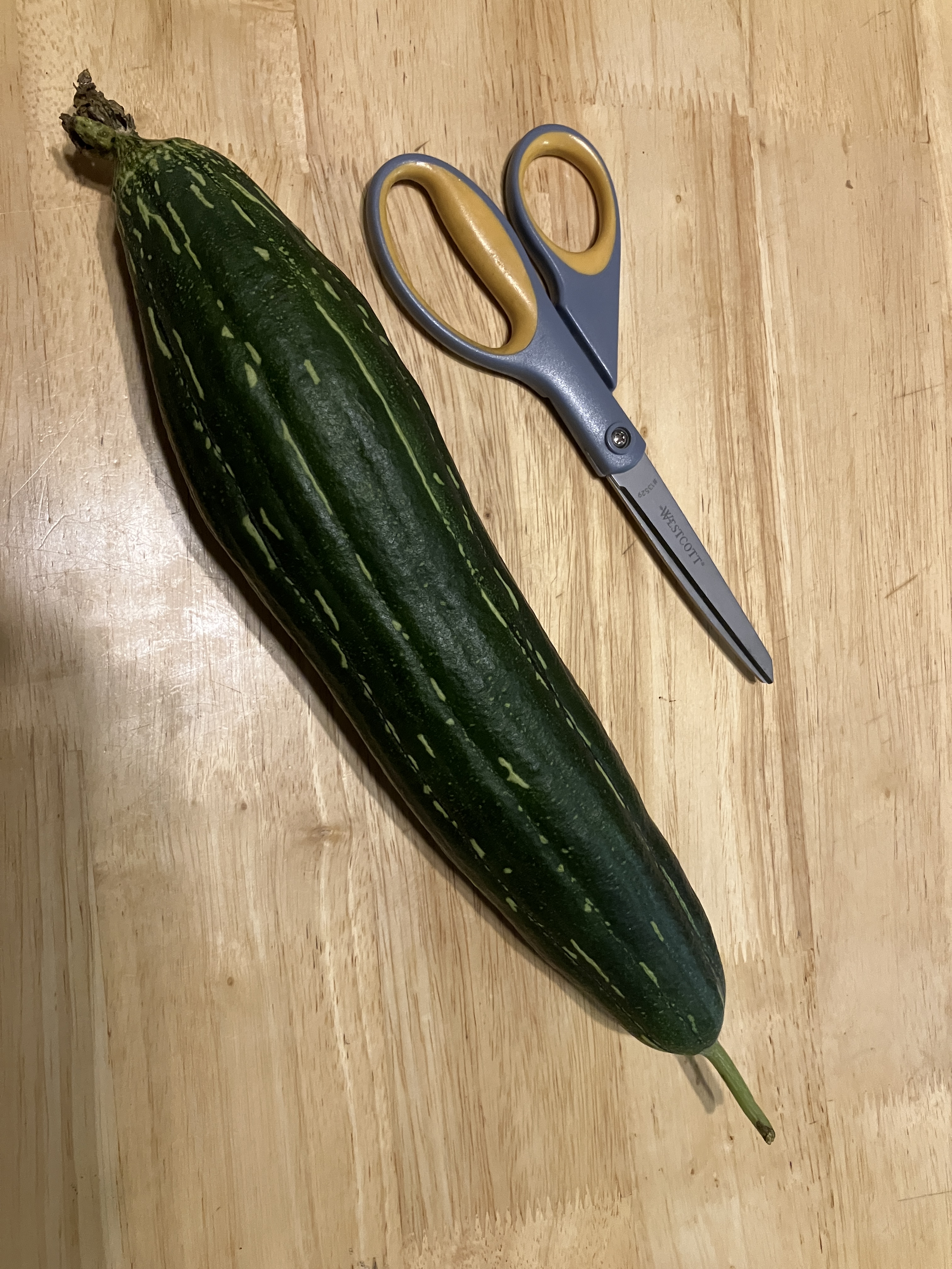 I grew it from seed and then transplanted it in May. It grew a long vine, but there were no flowers, so I figured it was a not going to. But then it started flowering in late August. I was like, are you kidding me, Loofah? It’s August, we’re shutting things down in like 4 weeks, 5 tops, little plant. This is not the tropics; you gotta pick up the manic NE pace! The vine grew 3 loofahs, and you can eat them when they are young. Sounds barbaric, doesn’t it? I left one to get big and with a little luck and climate change, hoped that it might mature and dry into a loofah sponge. The other 2, I harvested and ate — tasted like chicken! Just kidding, more like zucchini. That 3rd one I gave my laser focus. It grew bigger and the mild September weather turned into mild October weather. I left it on the vine. Maybe it will start to turn yellow and dry out, she said in desperation.