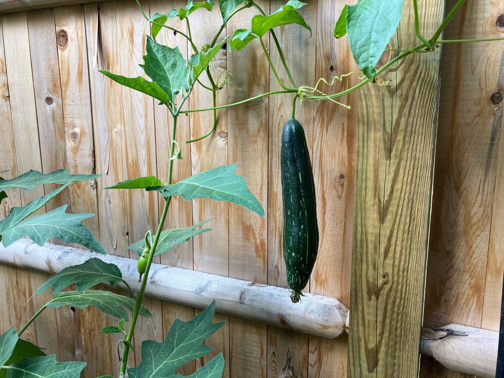Way back in October I posted about my lone loofah plant, and that I had managed to get 1 of the 3 loofah gourds to an adult size that might yield an actual loofah. Many people think loofah sponges, those things you find in fancy spa bath stores, come from the ocean. They do not! They are tropical plants that with some effort and patience can be grown in New England. I will say they tested my patience by not flowering until late August and then taking a long time to grow. Here is my 1 adult loofah in Oct.
