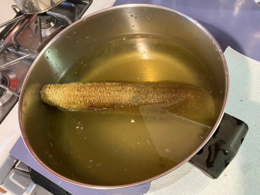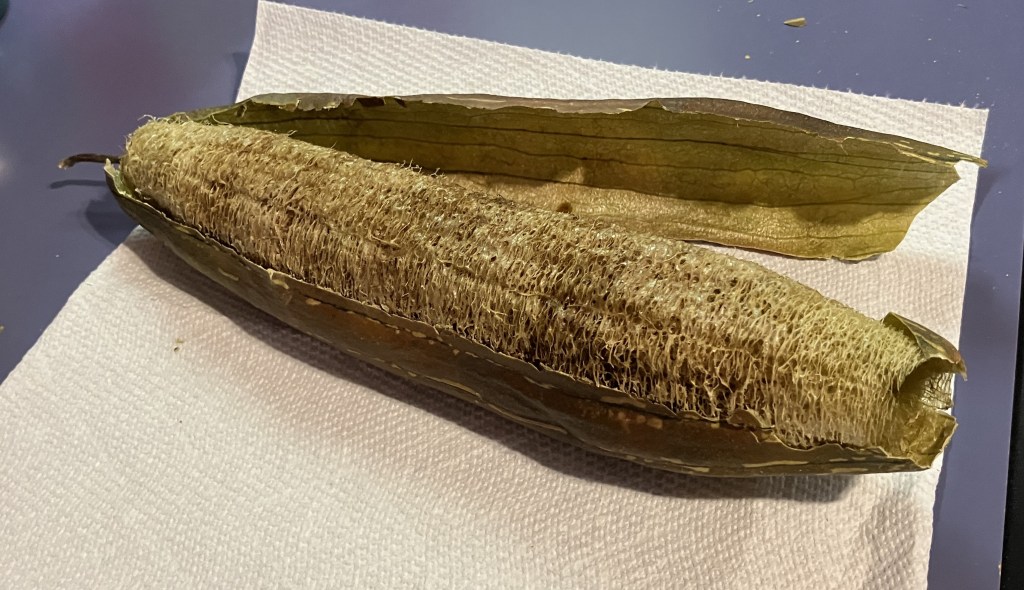I was in a grouchy mood before processing the loofah, but I had so much fun with it, I couldn’t stay that way. And once again gardening keeps me safe for humanity. You can thank the loofah!