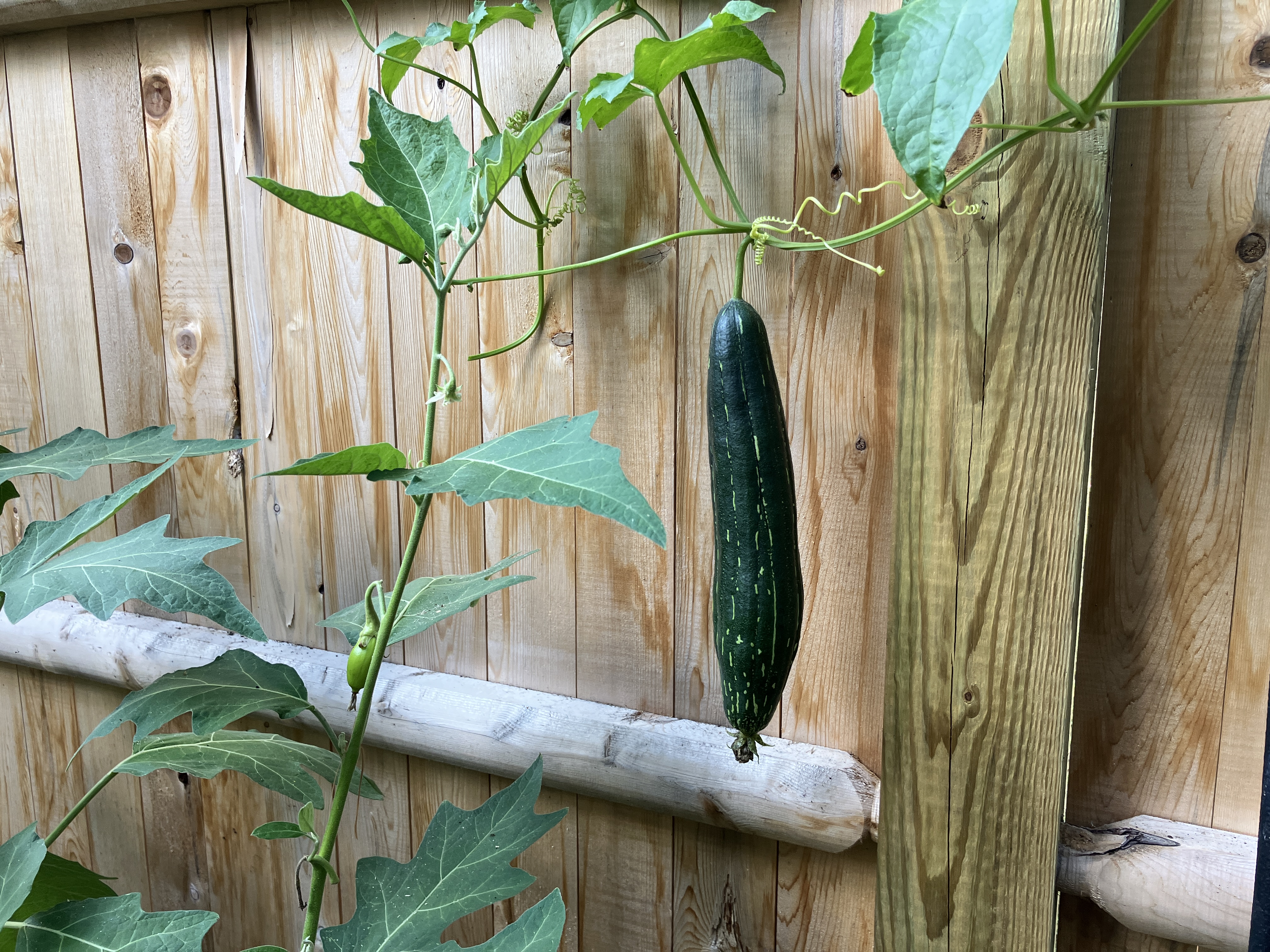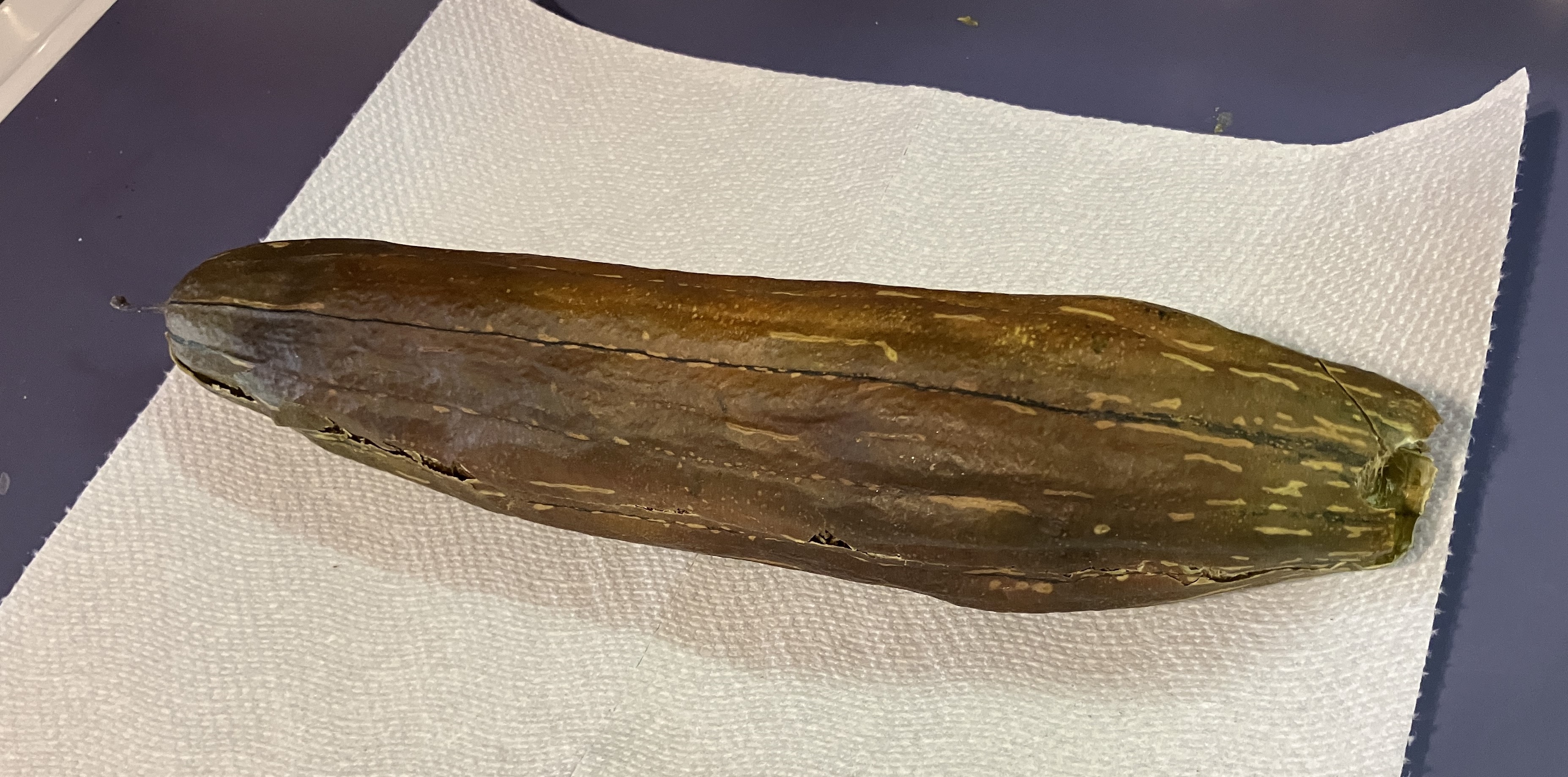 Way back in October I posted about my lone loofah plant, and that I had managed to get 1 of the 3 loofah gourds to an adult size that might yield an actual loofah. Many people think loofah sponges, those things you find in fancy spa bath stores, come from the ocean. They do not! They are tropical plants that with some effort and patience can be grown in New England. I will say they tested my patience by not flowering until late August and then taking a long time to grow. Here is my 1 adult loofah in Oct.