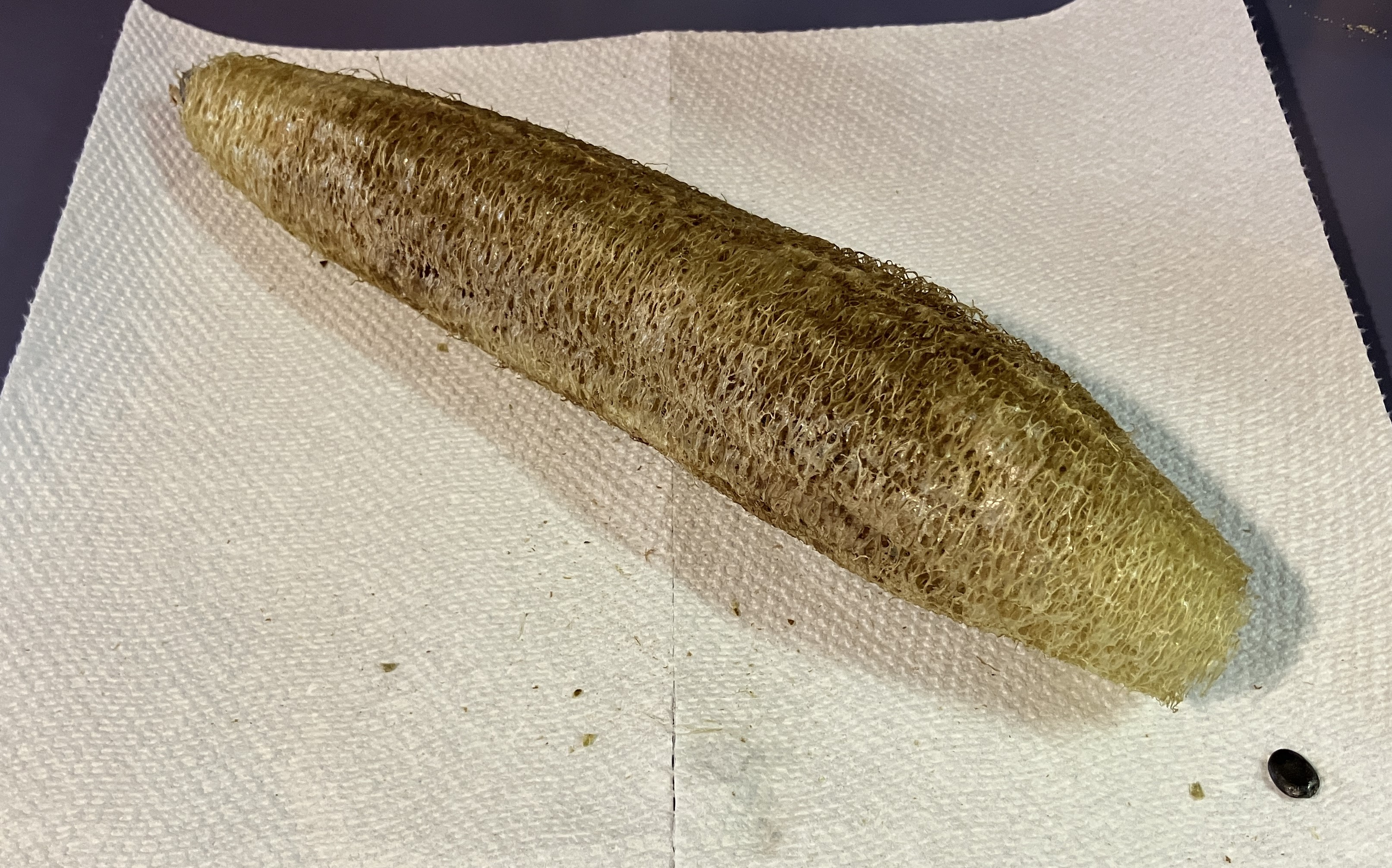 But as we like to say around here, light dawned on Mahblehead, and I moved it to the top of the baseboard heater. Ha, take that! It took another week or so, but dagnammit, I finally got a dried out loofah. You may applaud.