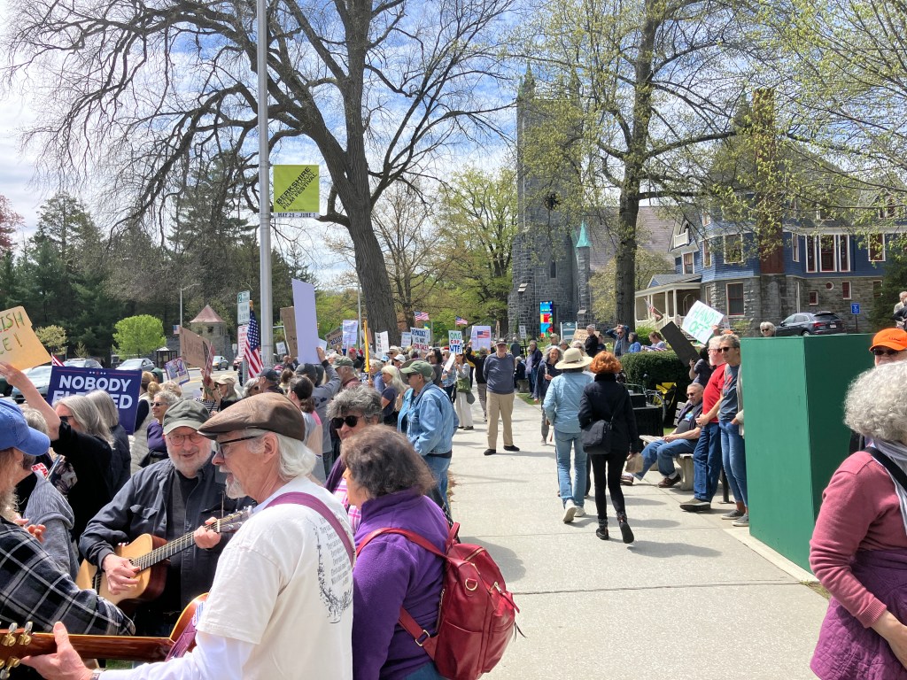 But that’s how this past May Day, I found myself in Great Barrington, MA, in the Berkshires, along with several hundred people in front of the City Hall. We were saying, “No!” to 8000 billion illegal and immoral acts the Cheeto flea is inflicting on us. I had planned the family trip months before, and was disappointed that I wouldn’t be in Boston for the protest. I went to the April 5 Boston protest with friends and the kid; the sea of people and signs was awesome in its size, power, and sense of purpose. It gave me energy and optimism to keep on fighting. Then I saw there was going to be a protest in Great Barrington. I had no idea what the protest would be like, and I didn’t have anyone to bring along or a sign. But I could show up and be present.